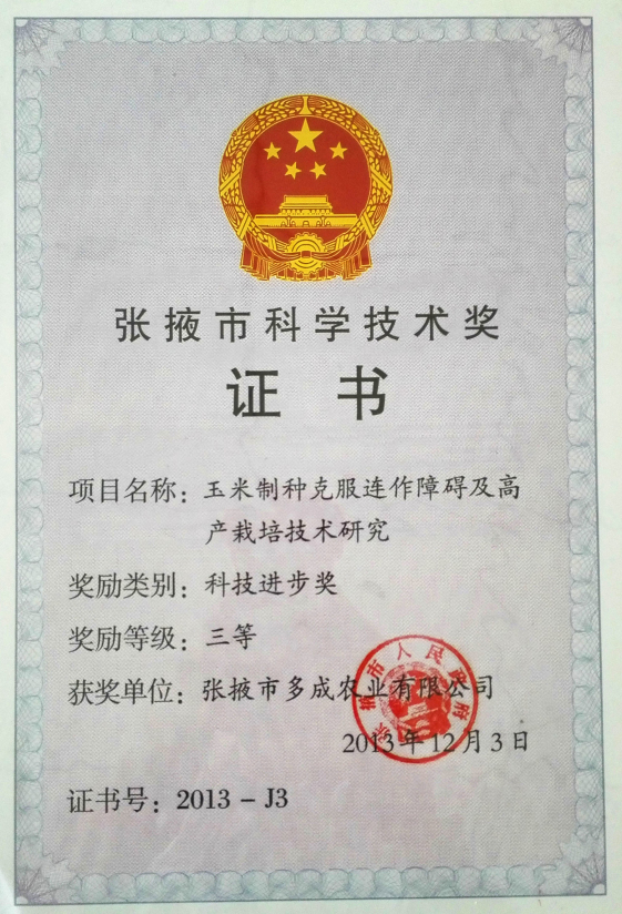 玉米制種克服連作障礙及高產(chǎn)栽培技術(shù)研究市科學技術(shù)獎三等獎